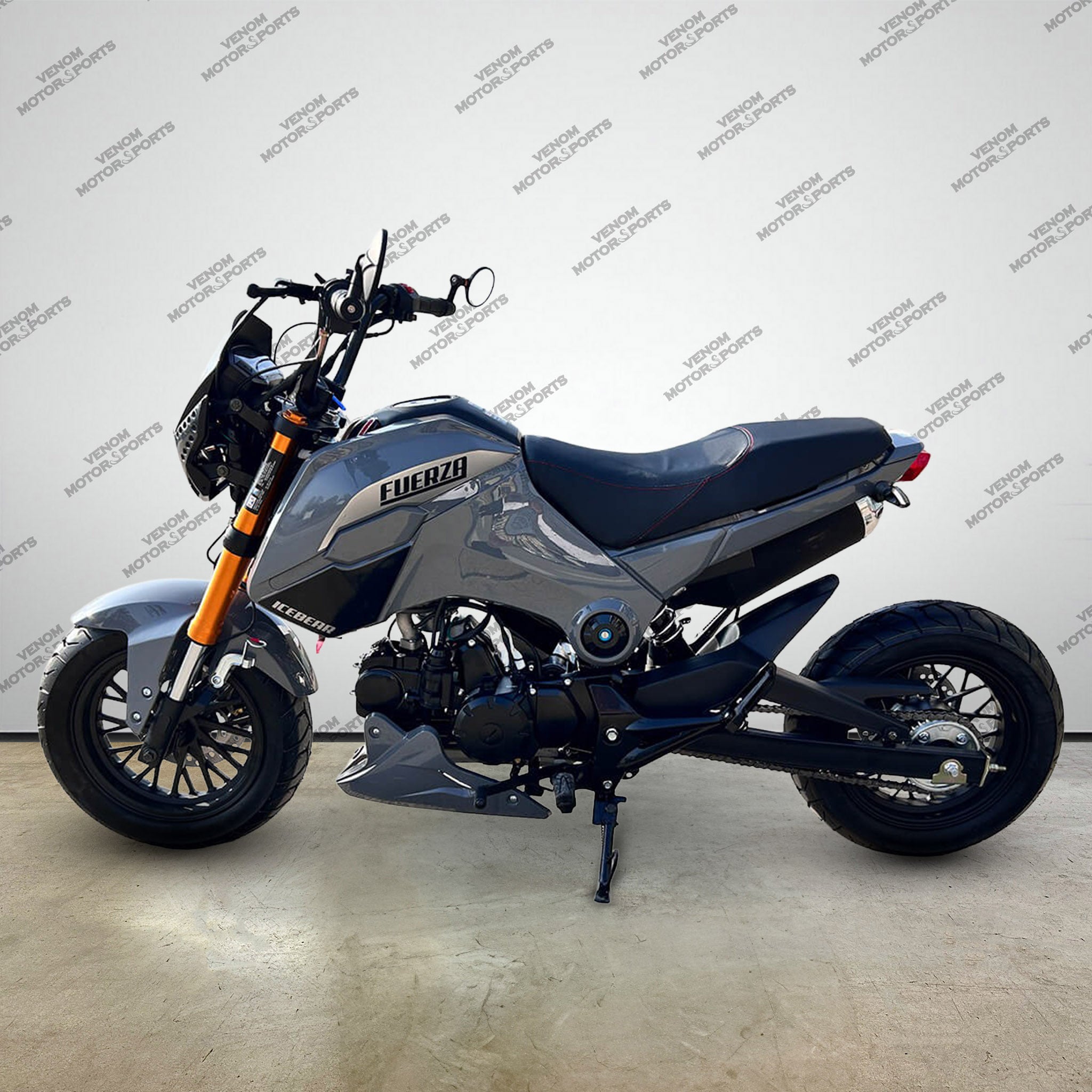 Venom welcomes your experience to the Icebear Fuerza 125cc Motorcycle! This stylish new ride offers a powerful 125cc 4-speed engine, plus an extended swing arm. You'll love the bright LED headlights, LED brake light, turn signals and 12'' inch rims for extra control. There's also a digital speedometer with speed, RPMs, mileage and fuel info. To top it off, the red leather stitching on the leather seat and gorgeous finish make this the perfect mid-size bike.